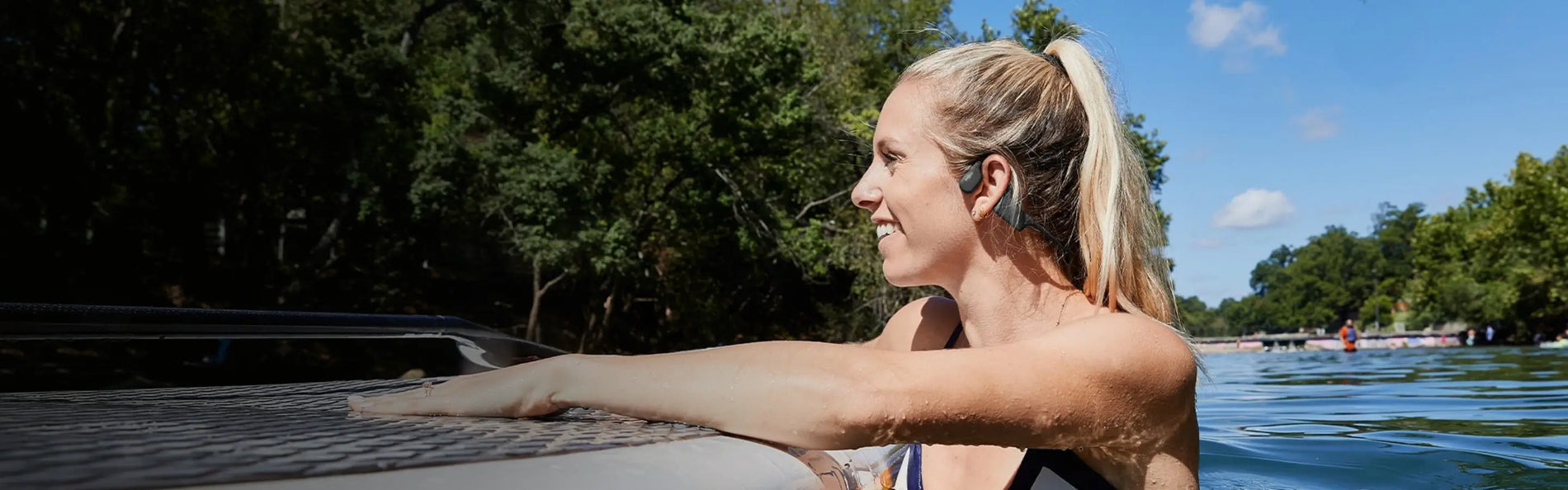 Our open-ear design powered by bone conduction technology ensures bud-free, comfortable listening all day, in or out of the water.
